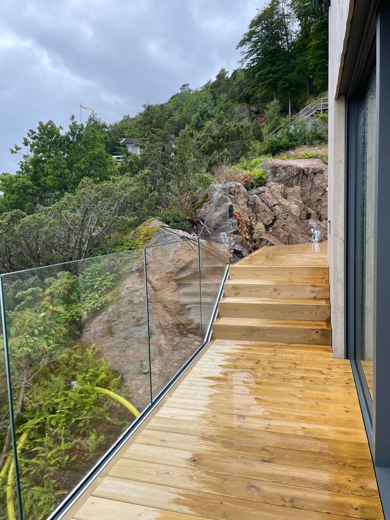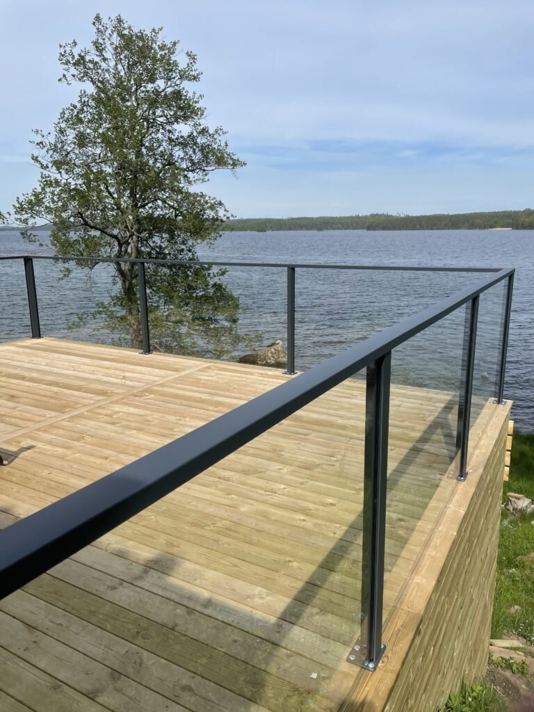 Våra glasräcken tillverkas av laminerat säkerhetsglas, vilket ger en optimal kombination av styrka och transparens. Ramarna är tillverkade av pulverlackerat aluminium för att ge en modern, ren estetik. Glaset är reptåligt och kräver minimalt underhåll, samtidigt som det erbjuder långvarig prestanda i alla väderförhållanden.
